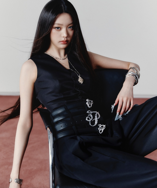 허리에는 크리스털 장식 알파벳 브로치와 레이어드 가죽 벨트를 매치해 고급스러운 포인트를 더했다. 실버 액세서리와 3D 네일 아트가 스타일링에 힘을 실었다.