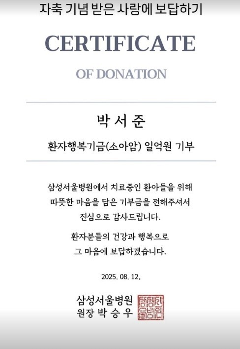 박서준은 지난 12일 삼성서울병원에 환자행복기금 1억 원을 기부했다. 소아암 투병 중인 환아들을 위해 마음을 전했다. 이날 SNS에 기부 증서도 공개했다.