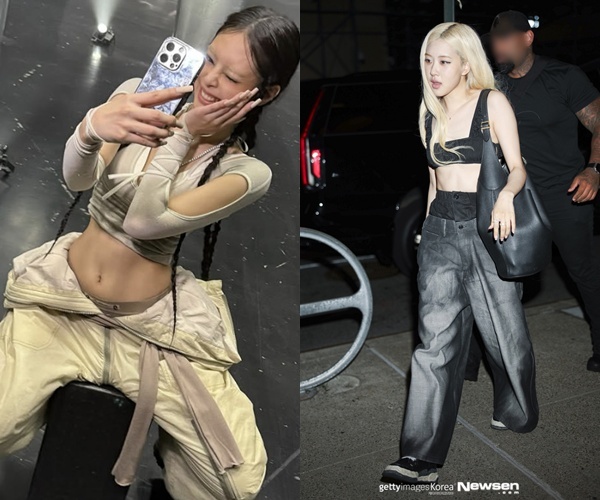 왼쪽부터 카리나 지젤/개인 소셜 계정 캡처로제는 두 겹으로 디자인된 독특한 바지를 입고 새깅 스타일을 연출했다. 바지 위에는 크롭탑을 입어 날씬한 허리를 강조했다.