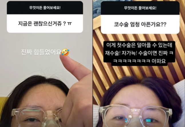 이후 그는 Q&A를 통해 성형 관련 질문에 직접 답했다. 그는 "저도 고어텍스로 수술했는데 유착이 있다. 재수술 힘드냐"는 질문에 "잘하는 선생님 한테 하시면 어렵지만 잘 제거해주시더라고요. 저도 무서워서 20년만에 했는걸요"라고 말했다. 이어 "지금은 괜찮으시냐"고 묻자 "진짜 힘들었어요"라고 아직 부기가 빠지지 않은 근황 사진을 공유했다. 또 "코수술 엄청 아프냐"는 질문에는 "첫 수술은 덜아플 수 있는데 재수술, 자가늑 수술이면 진짜 아파요", "감기까지 걸려서 기침때문에 지옥갔다 왔어요! 자가늑은 진짜 뒤짐", "솔직히 내가 다리수술 자궁근종수술 갑상선제거수술 해봤는데 그 중 으뜸으로(아프다)"라고 고통을 호소하기도 했다.