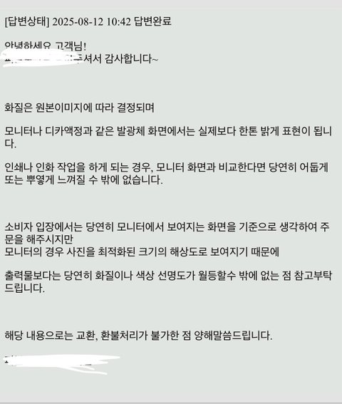 근데 업체는 그냥 “원래 사진 인화는 모니터 색상에 따라 다름 아몰랑~” 이러고 보낸 거 같아요.