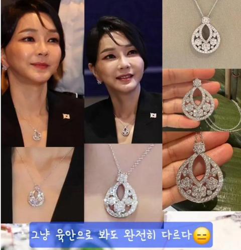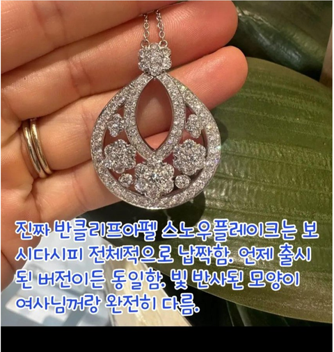 윗쪽(왼쪽문제의목걸이 오른쪽반클리프진품): 사진으로 보면 도톰하고 부피감이 있는 세팅, 다이아몬드가 둥글게 뭉쳐있는 형태, 전체적으로 광택과 반사 방식이 진품과 다릅니다. 이 디자인은 반클리프 역사상 공식 출시 기록이 없는 형태입니다. 즉, “진품 반클리프 스노우 플레이크”에서는 저렇게 도톰하게 올라온 디자인은 존재하지 않았습니다.