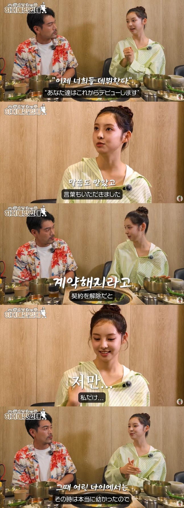 하린은 또 힘들었던 시절을 떠올리며 "2년을 어렵게 연습했다. 너무너무기쁘게 감사하게 전속계약까지 했다. 대표님께서도 너희 데뷔한다 열심히 해보자는 마음도 받았고. 그런데 어느날 갑자기 계약해지 통보를 받았다. 저만. 너무나 힘들었다"고 회상했다. 그러면서 대표님에게 인사도 못하고 멤버들도 못보고 일본행 비행기에 올라야 했다며 "어린 나이에는 힘들었다. 그래도 지금이야 그때 힘들었던 경험을 가지고 노력하는 것 같다"고 언급했다.