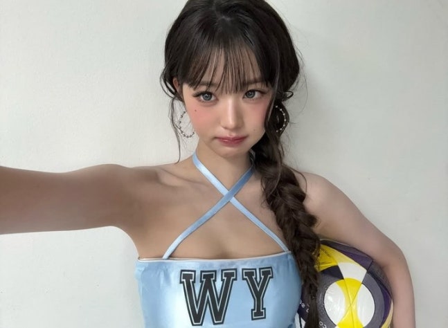 장원영은 수많은 관중 속에서도 독보적인 존재감을 드러냈다. 하늘빛 새틴 소재의 홀터넥 크로스 원피스를 착용해 청량한 무드를 완성했고, 타이트한 실루엣이 각선미를 한층 길어 보이게 했다. 청순함과 도발적인 매력을 동시에 발산한 스타일링이다.