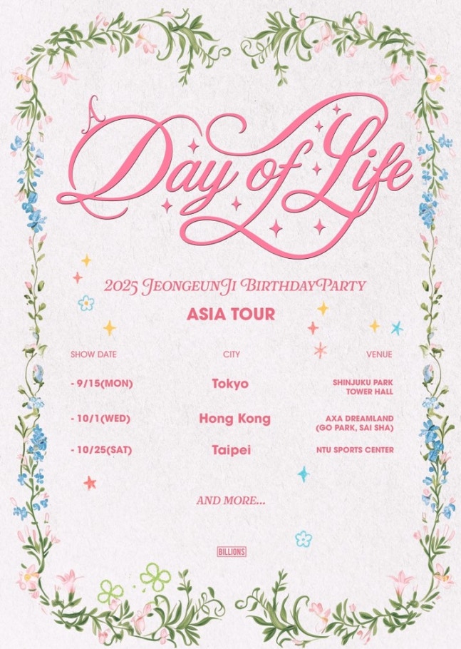 소속사 빌리언스는 지난 13일 오후 6시 공식 SNS를 통해 '2025 정은지 버스데이 파티 '어 데이 오브 라이프'(2025 JEONG EUNJI Birthday Party 'A Day Of Life')' 아시아 투어 포스터를 공개했다.