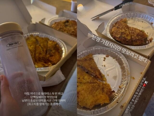 김다영은 14일 자신의 인스타그램 스토리에 “아침 저녁으로 필라테스 두 번 하고 단백질 쉐이크 먹었는데 남편이 종로 빈대떡을 사온 건에 대하여 (최고치를 향해가는 몸무게~)”라는 글과 함께 사진 두 장을 게재했다.