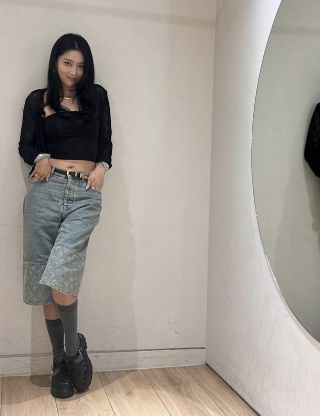 최근 오윤아는 SNS에 블랙 크롭탑과 시스루 니트 카디건, 버뮤다 데님 팬츠를 매치한 스트리트룩 사진을 공개했다.