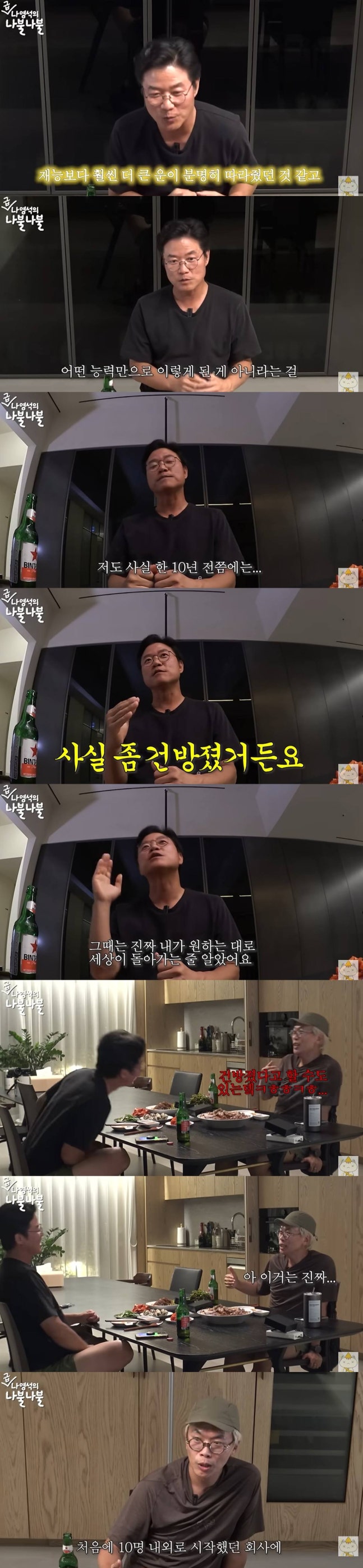 김태호는 "시대가 준 혜택을 우리가 본거다"라고 이야기했고, 나영석은 "아다리가 맞았다고 하지 않냐. 그래서 여기까지 온 거지. 이게 내가 갖고 있는 능력만으로 온 게 아니라는 걸 너무 잘 아니까 오히려 나이 들고 해서 조심스럽다"라고 이야기했다.