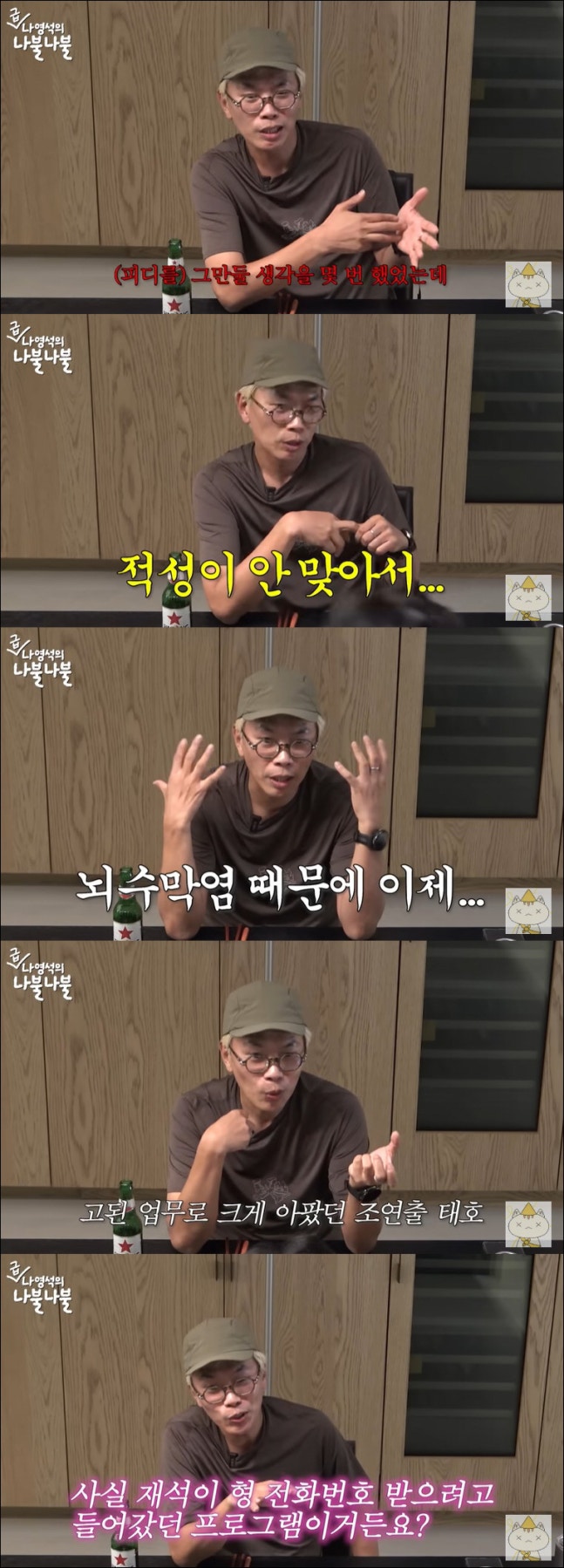 김태호PD는 "'무한도전' 시작하기 전에는 그만둘 생각을 몇 번 했다. 적성에 안 맞았다"고 고백했다. 김태호PD는 "그전까지만 해도 PD가 현장에서 목소리 큰 사람, 사회서 좋은 사람이 잘 되던 시절을 봐와서 그거는 나랑 적성에 안 맞는데 싶었다"고 말했고 나영석PD는 격하게 공감했다.