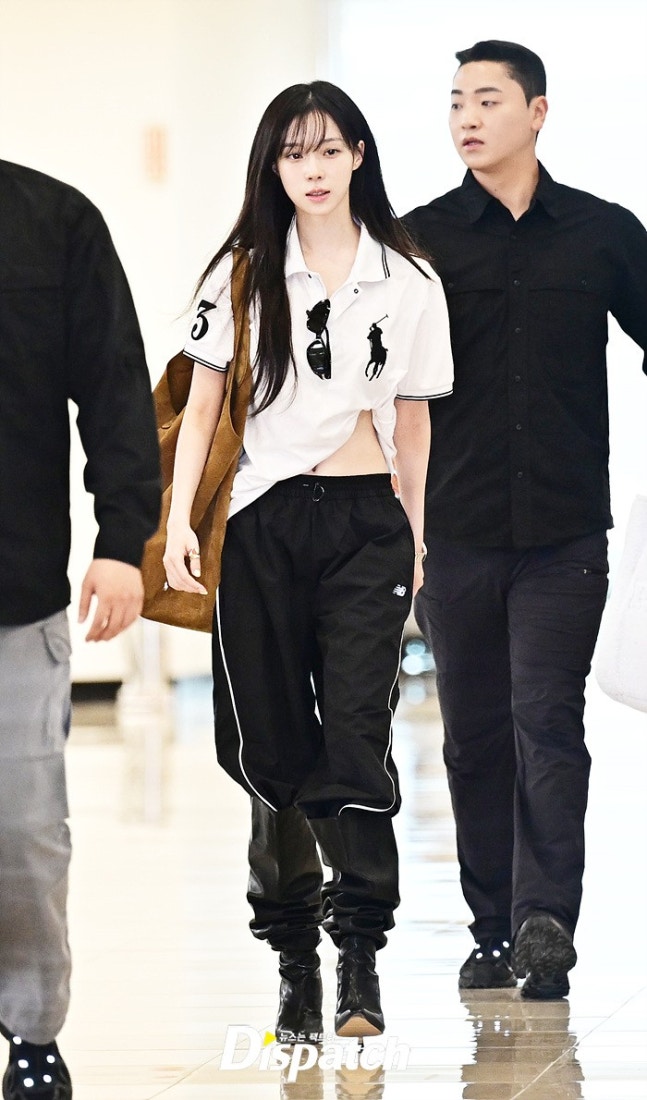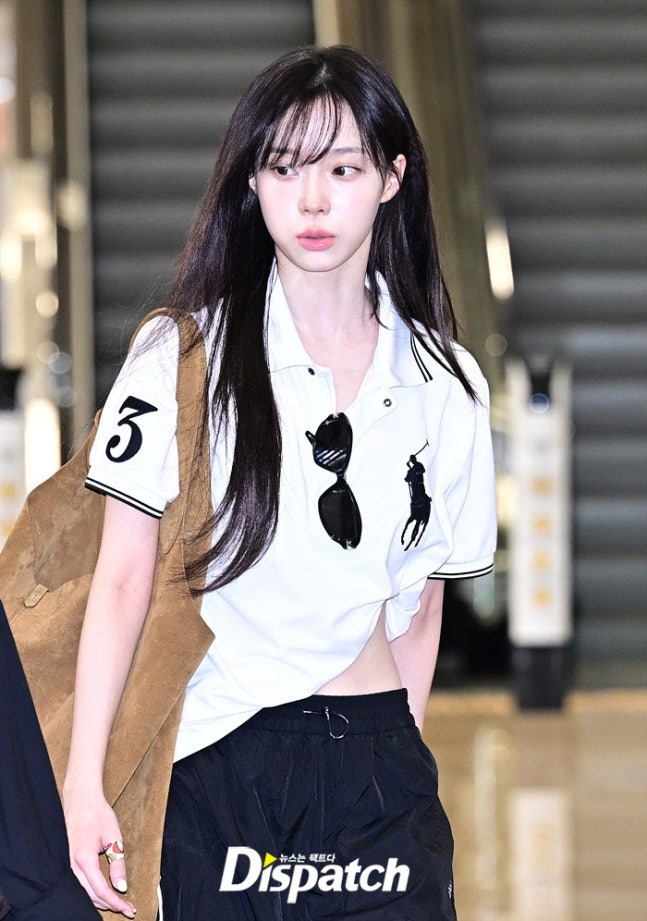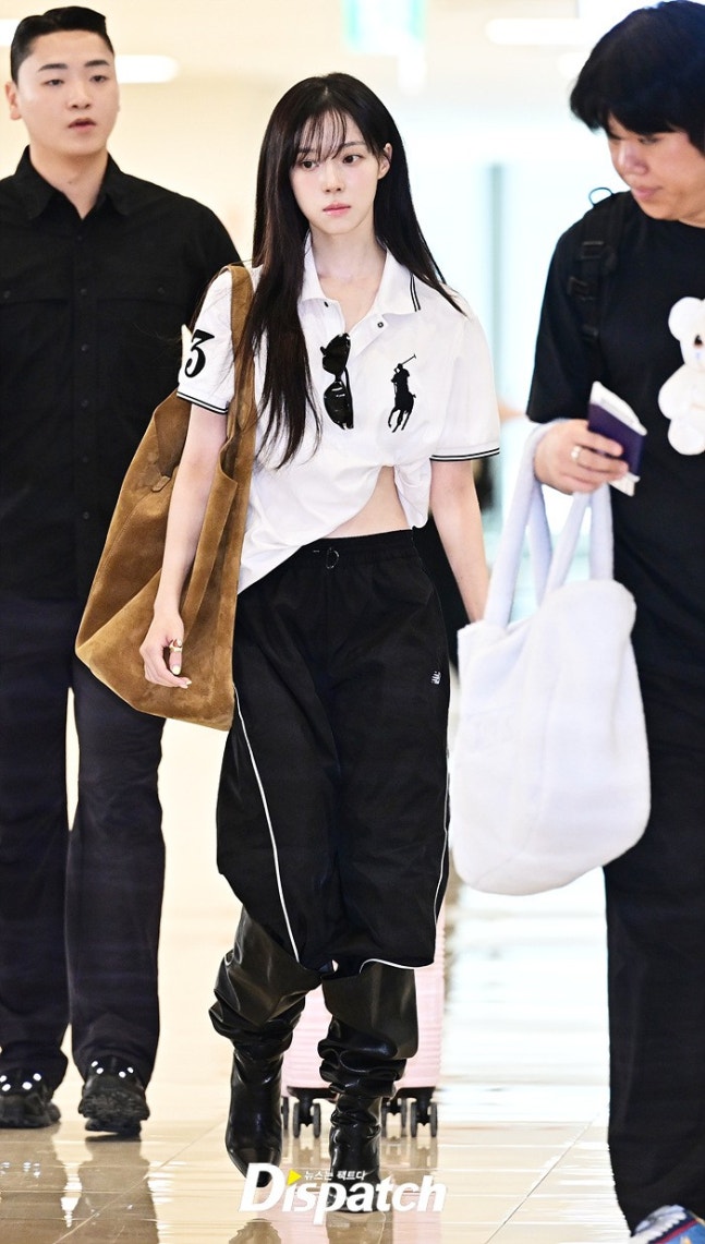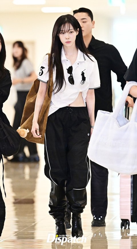 윈터는 블랙 앤 화이트 스타일로 심플한 공항패션을 완성했다. 작은 얼굴과 또렷한 이목구비가 돋보였다.