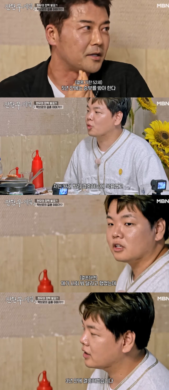 그러면서도 “어쩔 수 없다”며 “결혼을 억지로 하고 싶진 않다”고 솔직하게 고백했다. 이에 곽튜브는 “저는 원래 ㅃㆍㄹ리 결혼을 하고 싶었다”고 서두를 열었다. 전현무는 “빨리 결혼을 하지 않으면 나처럼 된다”며 “35~36세쯤 결혼해서 안정해야 네 생활이 바뀐다”고 조언했다.