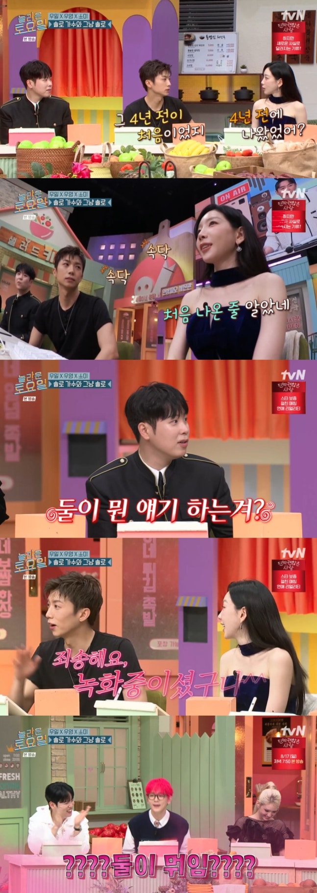 속삭이는 우영과 태연에 스튜디오는 "둘이 무슨 이야기를 하냐", "사담을 하냐"며 어리둥절해 했고 우영은 "죄송하다. 녹화중이었구나"라고 이야기해 묘한 분위기를 풍겼다.