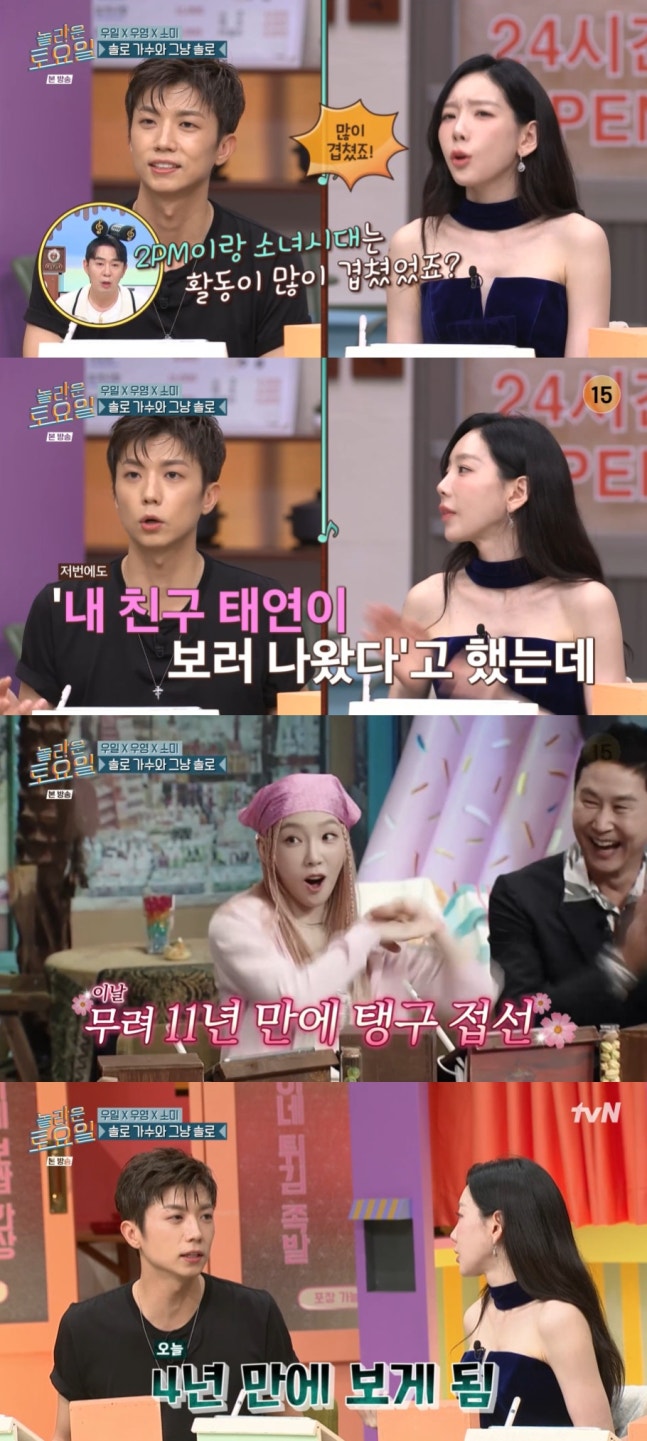 또한 "우영이 인터뷰에서 오늘 나온 이유의 8할이 태연이라고 하더라"라는 말을 들은 태연은 "티도 안 내더니"라고 이야기했고, 우영은 "저번에도 내 친구 태연이 만나러 왔었다"며 4년 전에도 '놀토'를 통해 11년 만에 만났음을 밝혔다.