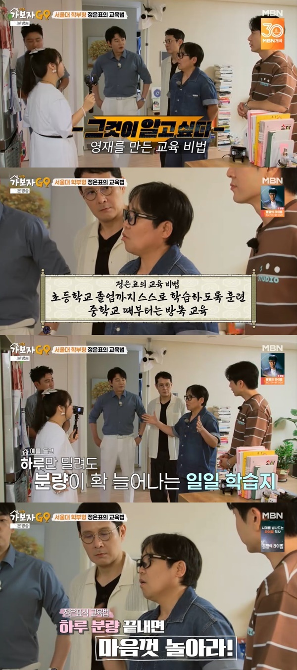 정은표는 “이런 건 있다. 학습지가 밀리면 해야 할 양이 많아진다. 어느 날부터 ‘이것만 하고 놀아라’ 하니까 애들이 새벽 6시부터 공부를 하더라. 놀고 싶어서”라며 스스로 학습법을 설명했다. (사진=MBN ‘가보자GO 시즌5’ 캡처)