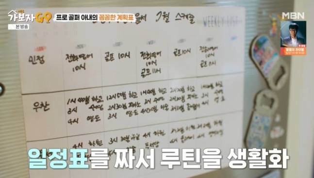 조현재와 아내, 그리고 두 아이가 함께 찍은 가족사진도 있었다. 아이들은 만 7세, 만 3세라고. 냉장고엔 식단, 일정표가 붙어 있었다. 아이들 교육 담당은 프로 골퍼 출신인 아내 박민정 몫이라고.