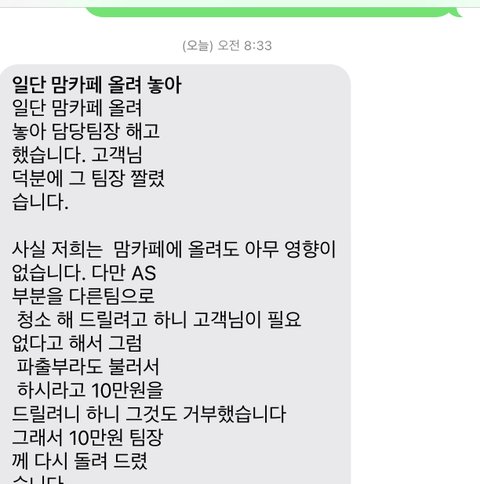 남자 팀장님 짤랐고, 제가 as를 다 거부해서 뭘 해줄수가 없다며