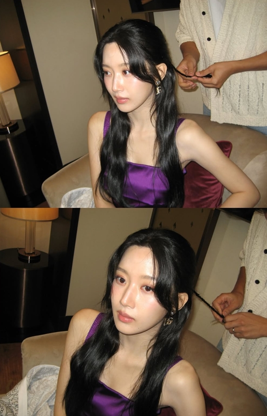 공개된 사진 속 문가영은 보라색 드레스를 입고 헤어를 손보고 있는 모습이다. 민소매의 고급스러운 드레스가 우아한 그녀와 잘 어울린다. 그녀는 손을 입술 옆에 갖다 대 뾰로통한 표정을 짓고 있다.