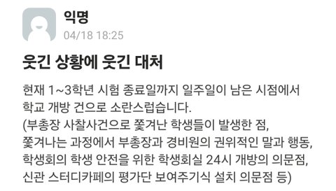 혹시 너희 학교도 이렇게 강압적이고 총장이랑 학생이 서로 이렇게 적대적이야? 싸우는 현수막도 걸리고? 아니라고 하면 난 이 학교 그만두고 다른 학교로 편입 할 생각이야 정말 옆에 친한 친구나 동생이라고 생각하고 진지한 조언 부탁할게 꼭 댓글 달아줘...