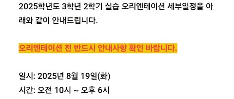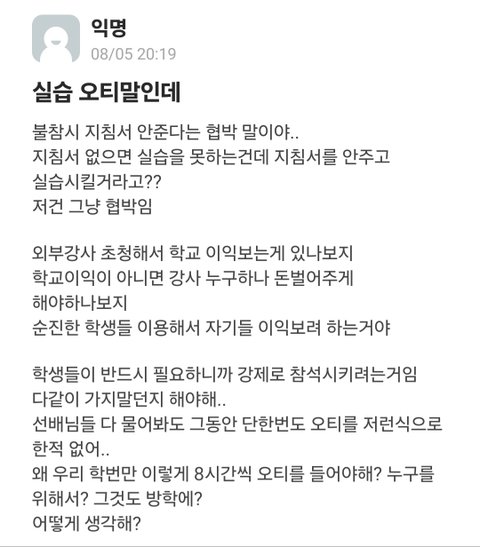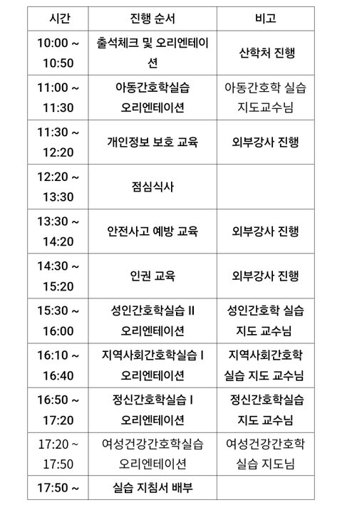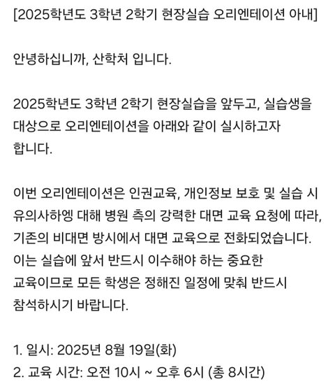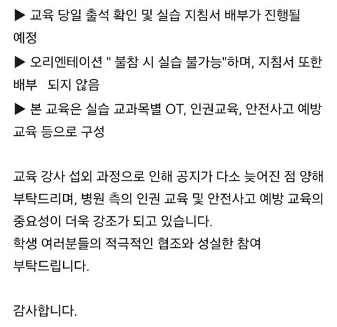 -병원 실습 나가기 전 3학년 1학기 때 실습 오티(3시간)를 이미 수료 했음. 근데 여름 방학 중에 8시간(10:00~17:00) 실습 오티를 또 하겠다고 공지를 올림. 선배들에게 물어보니 이런 경우는 처음이라 함. 방학 중 하루에 시행하는 OT임에도 불구하고 타지 학생들에 대한 교통비 등 지원이 하나도 없으며 불참할 경우 지침서를 받을 수 없고 병원 실습또한 불가능 할 것이라고 공지함. 또한 이 과정 중 병원에서 강력히 요구했다는 근거 서류 등을 학생들에게 공유하지 않음.