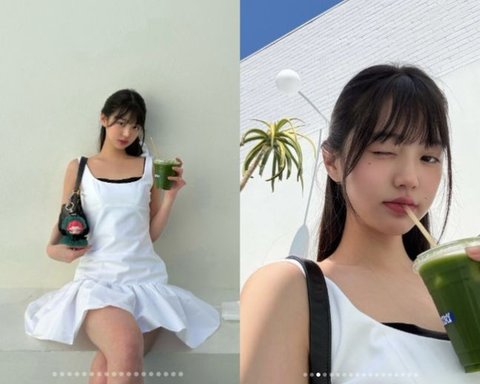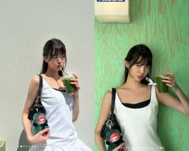 사진 속 장원영은 민소매 화이트 원피스를 입고 한 손에는 가방을, 한 손에는 음료수를 들고 포즈를 취하고 있다.