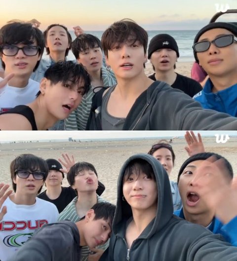 이날 LA 바닷가를 배경으로 카메라를 켠 멤버들. RM과 슈가는 “저희 잘 지내고 있다”, “열심히 앨범 작업 하고 있다”고 말했다. 이 가운데 뷔와 진이 투닥거리며 장난을 치면서도 끈끈한 모습을 연출해 이목을 집중시키기도.