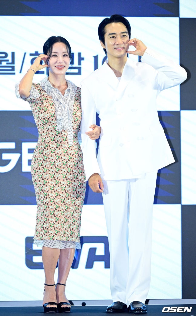 [OSEN=최규한 기자] 12일 오후 서울 신도림동 더 세인트에서 GENIE TV 오리지널 드라마 ‘금쪽같은 내 스타’ 제작발표회가 열렸다.‘금쪽같은 내 스타’는 대한민국 최고의 톱스타가 하루아침에 평범한 중년 여성이 된 후 펼쳐지는 눈물 콧물 휘날리는 세월 순삭 로맨틱 코미디다.배우 엄정화와 송승헌이 포토타임을 하고 있다. 2025.08.12 / draemer@osen.co.kr송승헌 역시 엄정화 못지 않게 망가짐을 불사른 열연을 펼친다. 송승헌은 "독고철은 가장 막 한 연기다. 계산하지 않고 독고철이 돼서 '이런거 어때요', '저런거 어때요' 하면서 편하게 연기했던 작품이다. 감히 말씀드리는데 송승헌이 지금까지 한 연기중에 가장 편한 모습을 볼 수 있지 않을까 싶다. 저는 편하게 했는데 시청자들은 새롭게 느낄수도 있을 것 같다. 그런점이 시너지를 일으켜서 장점이 될 수 있을 것"이라고 말했다. 그러자 엄정화는 "싸울 때도 사리지 않고 머리 더 잡아달라고 하고, 실제로 때려달라고 했다. 몸을 사리지 않는 연기를 했다"라고 송승헌의 열정을 알리기도 했다.