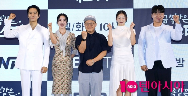 12일 서울 구로구 디큐브시티 더세인트에서 새 월화드라마 '금쪽같은 내 스타' 제작발표회가 열렸다. 엄정화, 송승헌, 이엘, 오대환, 최영훈 감독이 참석했다. '금쪽같은 내 스타'는 하루아침에 평범한 중년 여성이 된 대한민국 최고의 톱스타가 펼치는 세월 순삭 로맨틱 코미디다. 25년의 세월을 단숨에 건너뛴 경력 단절 톱스타 봉청자(엄정화)와 그를 돕는 독고다이 경찰 독고철(송승헌)의 얘기다.