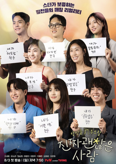 지난달 3일 첫 방송된 tvN 새 예능 ‘진짜 괜찮은 사람’은 연예인이 주선자가 되어 진짜 괜찮은 내 친구를 소개해 주는 프로그램이다. 조세호·강소라·김남희·허영지·이미주·지예은·김영광·이관희 등 8인의 스타가 직접 친구들을 소개하며, 기존 연애 예능과는 다른 매칭 리얼리티로 시청자의 관심을 모으고 있다.