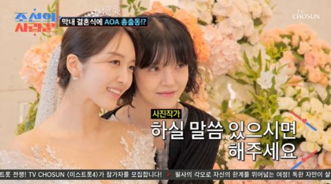 결혼식에는 지인들도 많이 찾아왔다. 특히 AOA 멤버들이 와 더욱 뜻깊었다. "하실 말씀 있으면 한 말씀 하셔라"라는 사진작가에 지민은 울컥하며 "축하해"라고 말을 잇지 못했다.