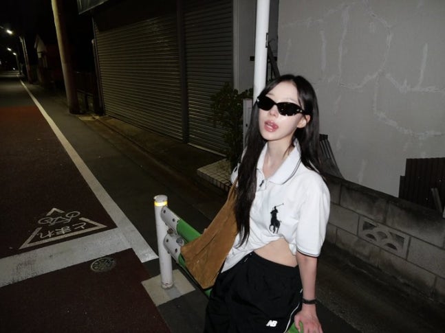 마지막 사진 속 윈터는 블랙 선글라스를 착용해 한층 도도한 분위기를 자아냈다. 혀를 살짝 깨문 포즈와 플래시 조명이 어우러지며, 자신만의 개성을 뚜렷하게 드러냈다.