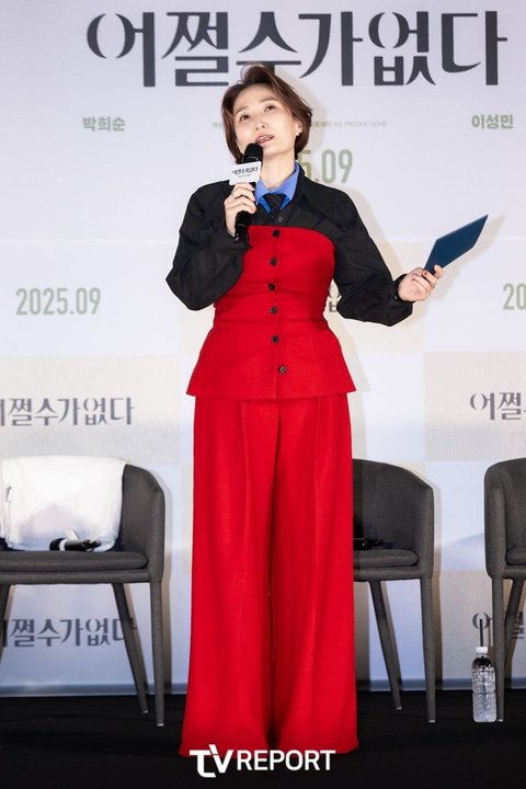 배우 박경림이 19일 오전 서울 용산구 용산 CGV아이파크몰점에서 열린 영화 '어쩔수가없다' 제작보고회에 참석해 진행을 맡고 있다.
