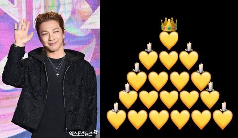 공개된 사진에는 빅뱅의 상징색인 노란색으로 된 하트 19개가 산처럼 쌓였으며, 촛불과 함께 왕관도 함께 얹어져있었다.