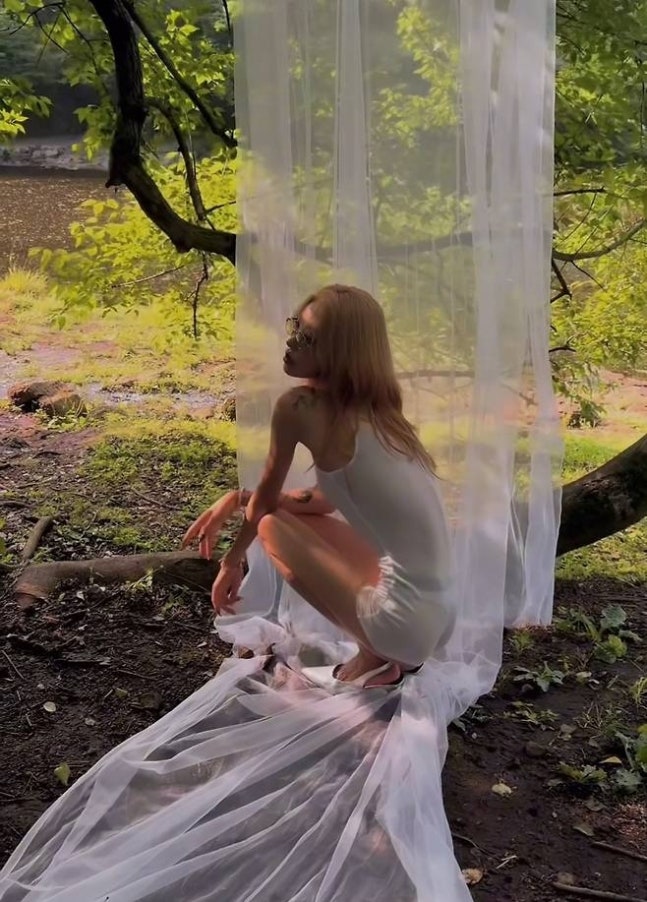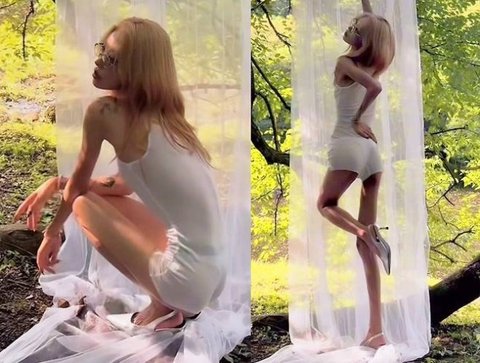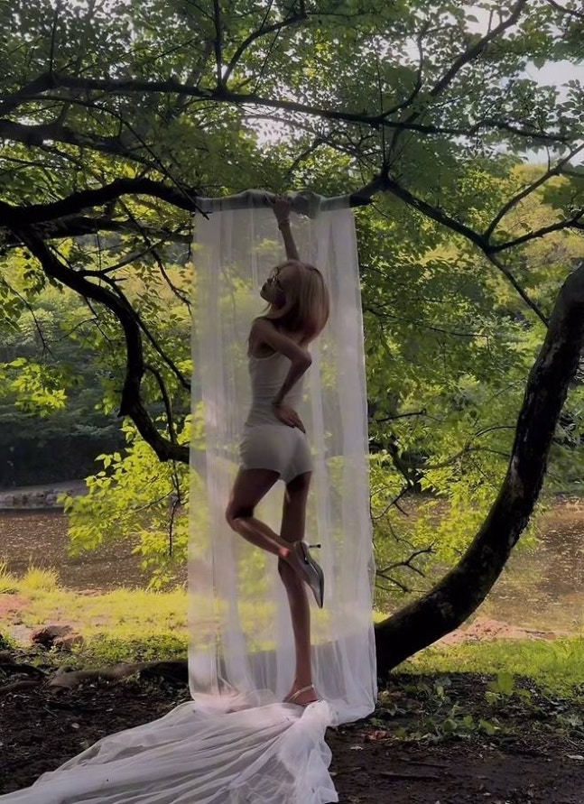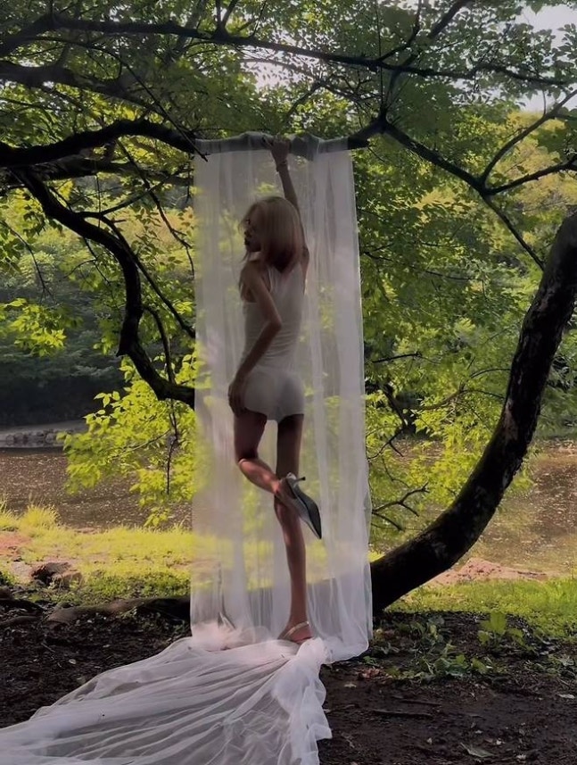 숲속에 걸린 얇은 커튼 사이에서 포즈를 취한 그는 군살 없는 바디라인과 길게 뻗은 각선미로 시선을 사로잡았다. 금발 헤어와 안경으로 포인트를 준 스타일은 한층 성숙하면서도 몽환적인 분위기를 완성했다.