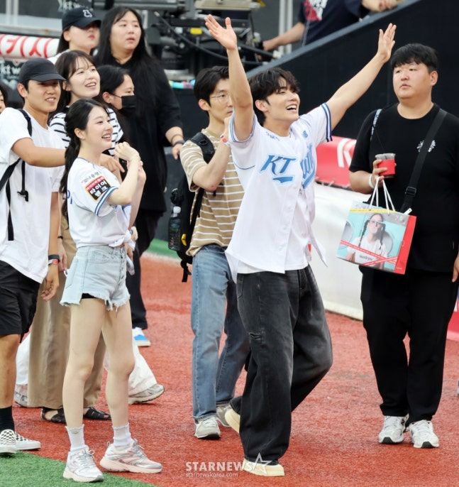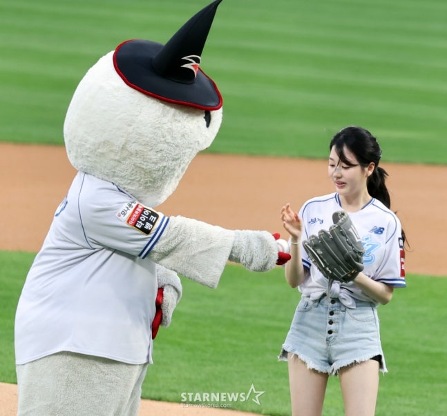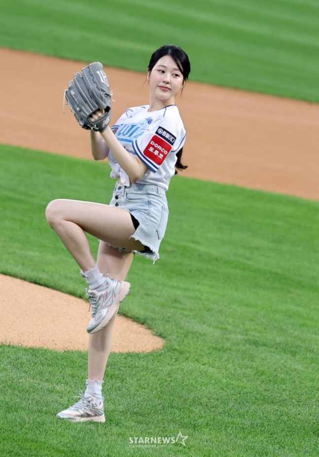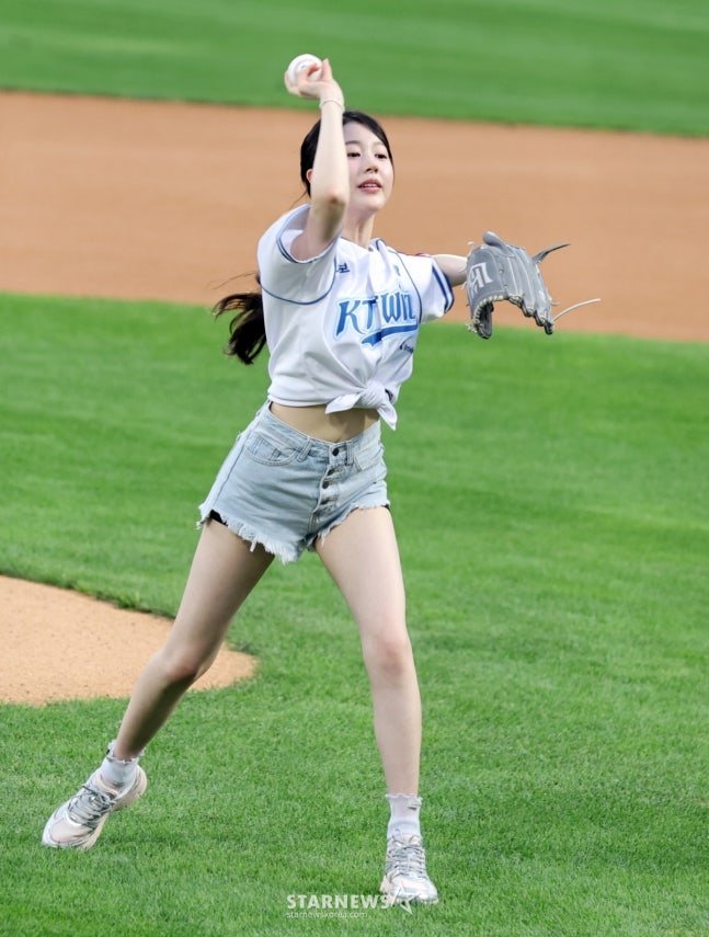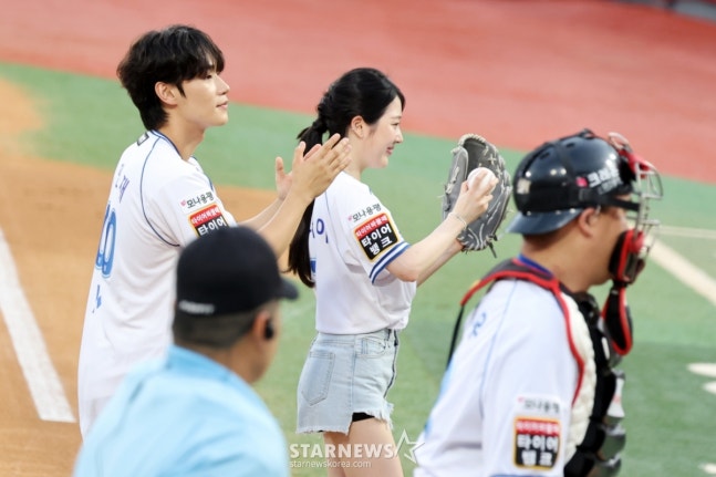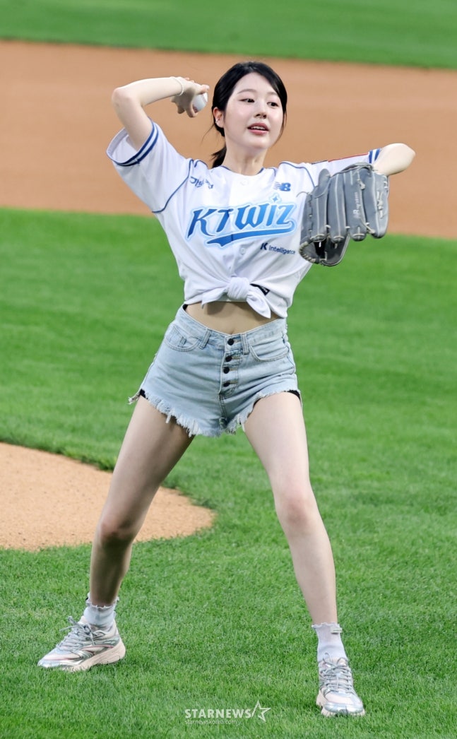 '금쪽같은 내 스타' 배우 장다아가 20일 수원KT위즈파크에서 열리는 2025 신한 SOL Bank KBO리그 KT위즈와 SSG랜더스 경기에서 시구를 하고 있다. 시타는 배우 이민재가 나섰다. 2025.08.20.