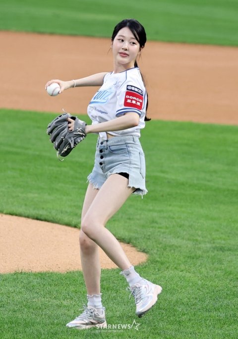 '금쪽같은 내 스타' 배우 장다아가 20일 수원KT위즈파크에서 열리는 2025 신한 SOL Bank KBO리그 KT위즈와 SSG랜더스 경기에서 시구를 하고 있다. 시타는 배우 이민재가 나섰다. 2025.08.20.