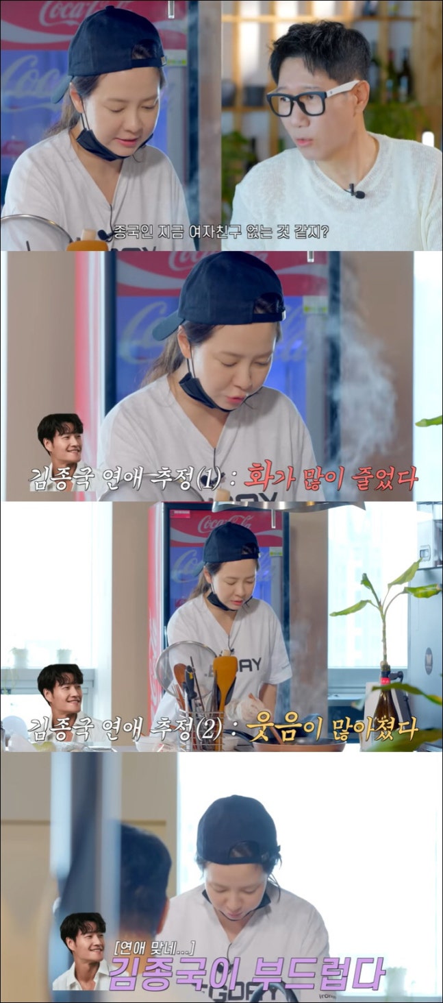 지석진은 "종국이는 여자친구 없는 거 같지?"라고 물었고 송지효는 "있는 거 같던데? 아니야? 있지 않아?"라고 밝혔다. 놀란 지석진은 "이거 특종이다. 왜 그런 생각을 했냐"고 물었고 송지효는 "요즘 화가 많이 줄었다. 요즘 웃음이 많아진 거 같다"고 추측했다. 이에 지석진도 "걔가 그렇게 깔깔 거리고 웃는 애가 아니다"라고 인정했고 송지효는 "종국오빠가 요즘 많이 유해졌다. 그냥 내 느낌"이라고 밝혔다.