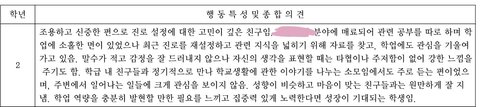 고등학교 생기부인데 저렇게 써놓음 나 그냥 진짜 사고같은거 1도 안치고 조용히 학교다니는 평범한 애였고 친구들 사이에서도 조용한 편이었는데 담임이 저렇게 써놔서 진짜 첨에 잘못본줄알았음 근데 다른 애들은 괜찮게 써줬대 저것때문에 생기부 걍 망함..ㅋㅋ