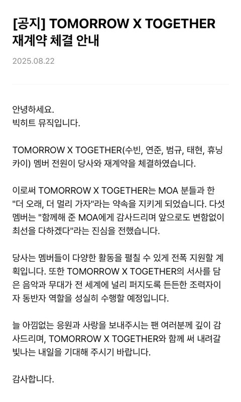 ‘우리가 늘 더 오래 더 멀리 가자고 얘기했었잖아요 그 약속을 지키고자 저희 다섯 같이 투모로우바이투게더로서 재계약을 마쳤습니다’