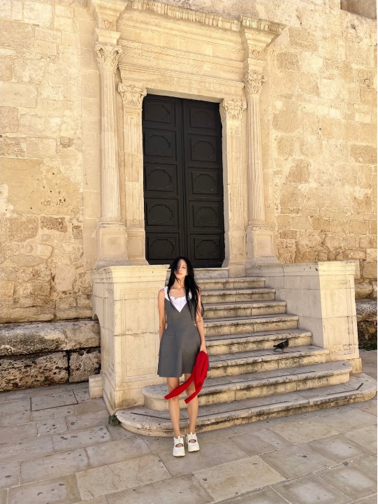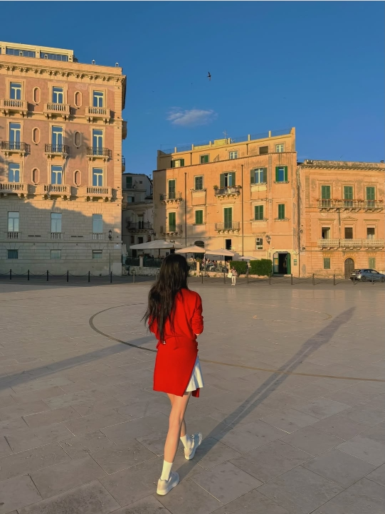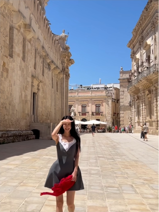 사진 속 한예슬은 고풍스러운 이탈리아 시라쿠사 거리를 배경으로 회색 미니 드레스와 레드 카디건을 매치해 눈길을 끌었다.