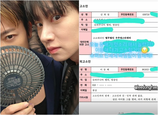 김희철은 23일 자신의 계정에 멤버 동해에게 보내는 고소장 사진을 공개했다.