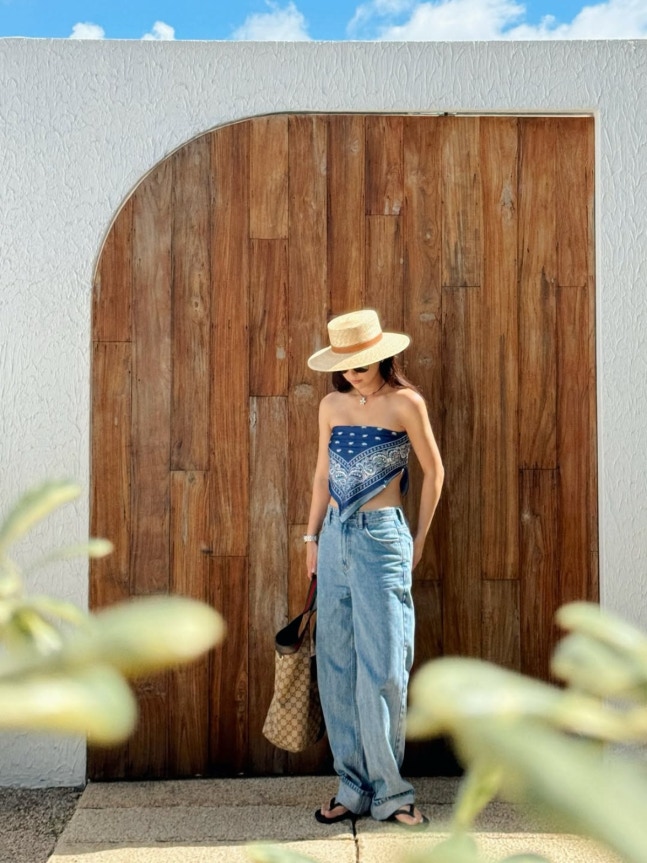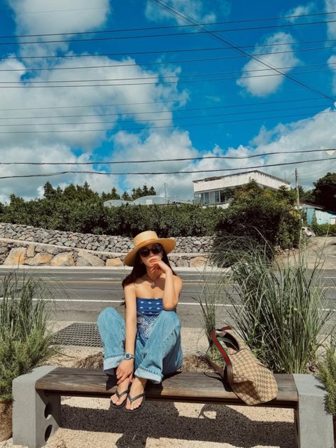 공개된 사진 속 기은세는 제주 거리에서 커다란 챙의 보터햇과 선글라스를 매치하고 반다나를 톱처럼 연출한 네이비 패턴 상의에 와이드 데님으로 여름 무드를 극대화했다. 벤치에 앉아 카메라를 바라보는 담백한 표정만으로도 화보를 완성했고 로고 패턴의 토트백을 들어 실용적인 리조트룩을 완성했다.