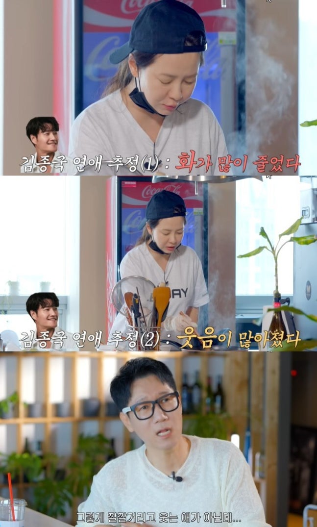 지석진이 “특종이다”라고 호들갑을 떨자, 송지효는 “있는 거 아닐까라고 하는 거다”라며 “오빠 요즘 화가 많이 줄었다. 그리고 요즘 웃음이 많아졌다”라고 열애를 의심한 이유를 밝혔다. 지석진은 “엄청 웃더라. 사실 그렇게 깔깔 거리고 웃는 애가 아닌데”라고 공감했다.