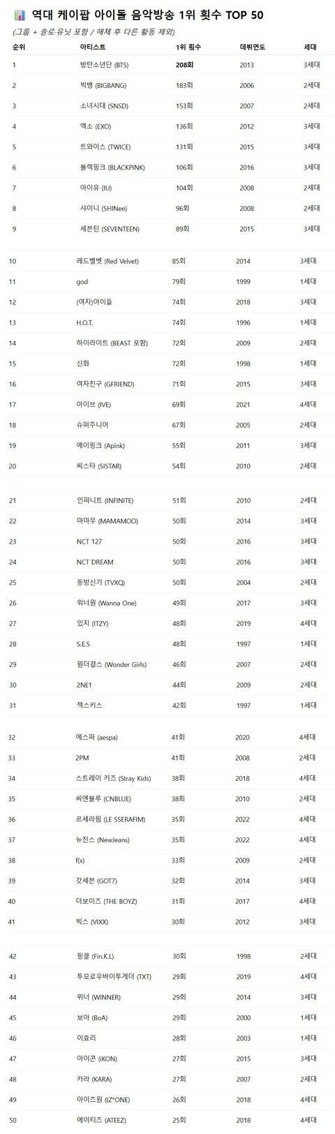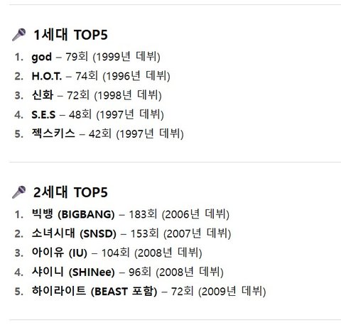 역대 케이팝 아이돌 음악방송 1위횟수 순위(그룹은 솔로,유닛 포함, 단 그룹 해체 이후 솔로나 유닛, 타그룹 재데뷔 1위는 미포함)