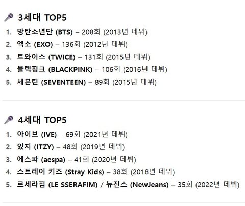 1위 방탄소년단(2013년 데뷔 3세대) 208회