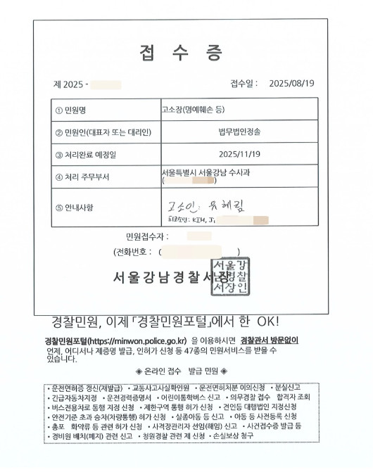 함께 공개한 사진에는 서울강남경찰서에 고소장을 접수한 접수증을 담았다.