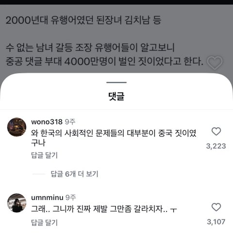 냅다 여자 불법촬영하고 여자때리고 여자죽인 남자들중에 잡혀보니 중국인인경우 거의 못봤는데 지금껏 혐오는 지들이 다 해와놓고 외부에서 갈라치기한다고 그러는것도 웃김 맨날 남탓하는것까지 완벽하게 한국인인데 뭔 중국인.. 이나라 여자들이 살아오면서 보고겪은게 있는데 외부탓하고싶나? 커뮤에 죄다 중국인이면 한국인은 어디 다죽었나 싶음 중국인한테 휩쓸린거면 지금부터라도 생각고쳐먹든가