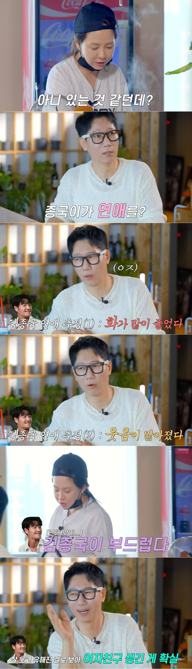 "왜 그런생각을 했냐"는 물음에 송지효는 "(김종국이) 화가 많이 줄었다. 요즘에 웃음이 좀 많아진 것 같다"고 이야기했다. 이에 공감하는 모습을 보인 지석진은 "사실 그렇게 깔깔대고 웃는 애가 아닌데"라고 말했다.