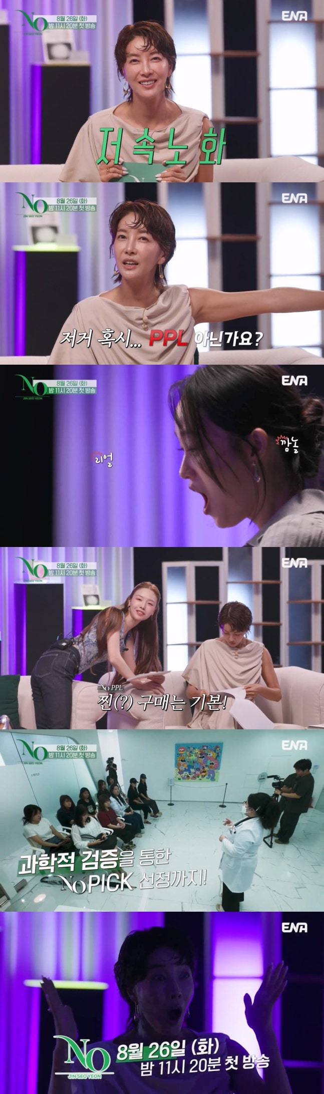 26일 첫 방송되는 ENA ‘진서연의 NO’는 요즘 화두인 ‘저속노화’를 첫 번째 주제로 다룬다. ‘진서연의 NO’ 1회 예고에는 노화를 늦추는 데 도움이 되는 ‘잇템’ 콜라겐 마스크팩 27종, 크림 미스트 10종이 등장한다.