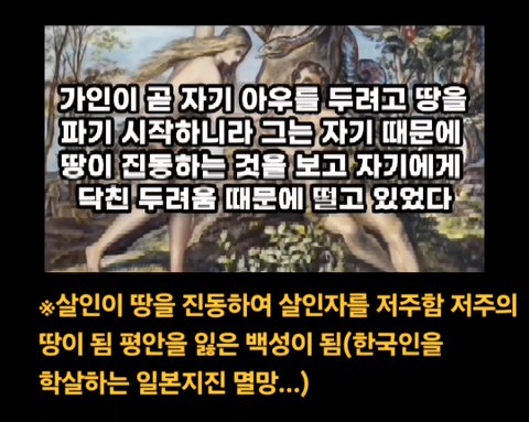 가인은 제사와 예물 드리기 싫어함 아담이 아벨을 미녀 루루와로 결혼 시키려하자 가인이 아벨을 죽이려함 ※살인이 땅을 진동하여 살인자를 저주함(한국인을 학살하는 일본지진 멸망..)