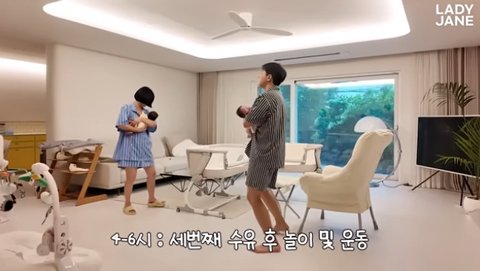 이후 두 사람은 스케줄표 대로 아이들을 케어하기 시작했다. 아침 6~7시에 기상해 아이들의 세수와 마사지를 하고, 8시가 되자 첫 수유를 했다. 이후 머리를 감고 아이들의 울음소리에 급히 나온 레이디제인은 "거의 머리를 한 4~5일만에 감은것 같다"며 "우는 소리 들려서 말리지도 못하고 바로 나왔다"고 털어놨다. 그는 "요즘에 별이가 등 센서가 생긴것 같다. 뭐만 하면 게속 안아달라고. 근데 우리가 구마를 했지 않나. 구마를 했는데도 안 고쳐지더라"라고 고충을 토로했다.